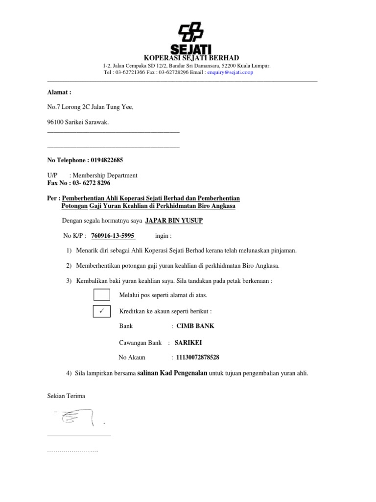 Borang Semakan Potongan Gaji Semenanjung Klik Di Sini. Untuk membatalkan polisi insurans anda perlu membuat surat yang bisa ditiru dari contoh surat. Contoh surat pemberhentian ahli koperasi letter 7saudara com.